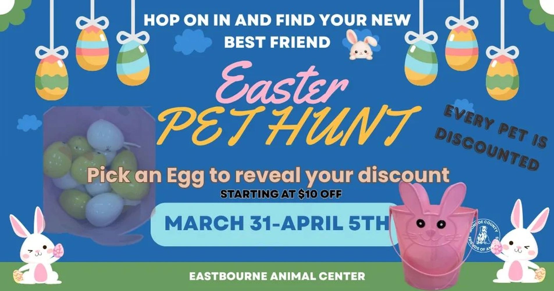 It's spring time. Consider adopting a new cat or dog to kick off the season. Pick an egg and see what your discount is.